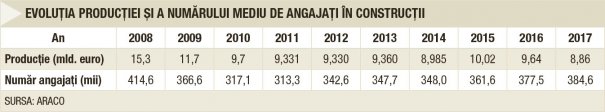 Activitatea constructorilor din 2017 a confirmat un an de minim pentru perioada 2008-2017, cu un volum valoric ajuns la 8,86 mld. euro, menţinând recesiunea tehnică confirmată de Eurostat la finalul anului 2016.