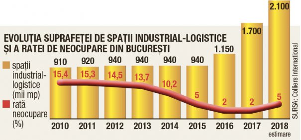 Planurile celor mai mari proprietari de depozite din ţară indică faptul că peste 700.000 de metri pătraţi de hale ar putea fi puşi pe piaţă în acest an, nivel record, cu 40% peste livrările din 2017, potrivit datelor companiei de consultanţă imobiliară Colliers International.