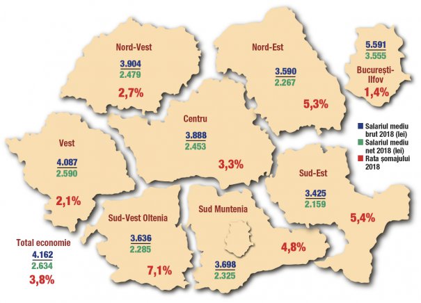 Cu excepţia regiunii Sud-Vest Oltenia, unde se regăsesc doar 396.000 salariaţi la nivelul lui 2018, toate celelalte regiuni (opt în total) au peste jumătate de milion de salariaţi. Diferenţele se păstrează şi în cazul câştigurilor salariale. Zona Bucureşti-Ilfov, unde sunt şi cei mai mulţi angajaţi, are un salariu mediu t de 5.591 lei şi mediu net de 3.555 lei. Pe locul secund se află regiunea Vest cu 4.087 lei salariu mediu brut şi 2.590 lei mediu net. Următoarea este regiunea care ocupă locul secund ca număr de angajaţi, respectiv Nord-Vest, unde regăsim un salariu mediu brut de 3.904 lei şi un mediu net de 2.479.