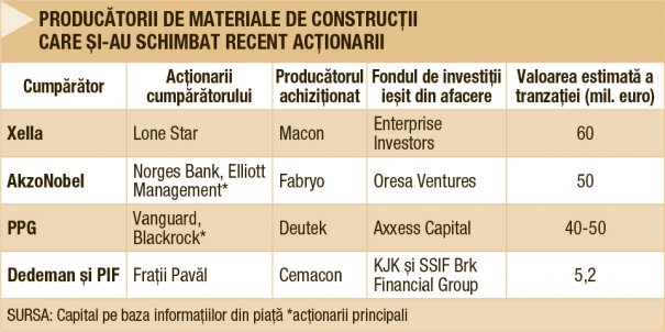 Piaţa materialelor de zidărie, evaluată la peste 280 mil. euro, a generat cele mai interesante tranzacţii din ultima jumătate de an. Producătorul german Xella International, numărul cinci pe segmentul producţiei de BCA, a cumpărat grupul Macon, lider pe aceast sector, şi ajuns să controleze aproape o treime din piaţă. Această mişcare a reprezentat ieşirea fondurilor poloneze de investiţii Enterprise Investors de pe piaţa locală a materialelor de construcţii. Investitorii polonezi mai deţin în România doar retailerul de jucării Noriel, cumpărat în 2016.