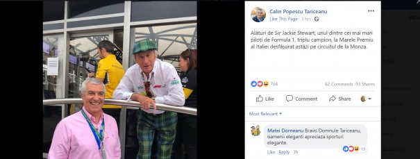 În acest timp, Călin Popescu Tăriceanu era complet relaxat, ca un adevărat prezidenţiabil. Aceasta s-a fotografiat cu Sir Jackie Stewart, unul dintre cei mai mari piloţi de Formula 1, triplu campion, la Marele Premiu al Italiei desfăşurat pe circuitul de la Monza. De altfel, este cunoscută pasiunea fostului premier pentru maşini. Are nu mai puţin de 5 autoturisme de epocă în colecţia sa.