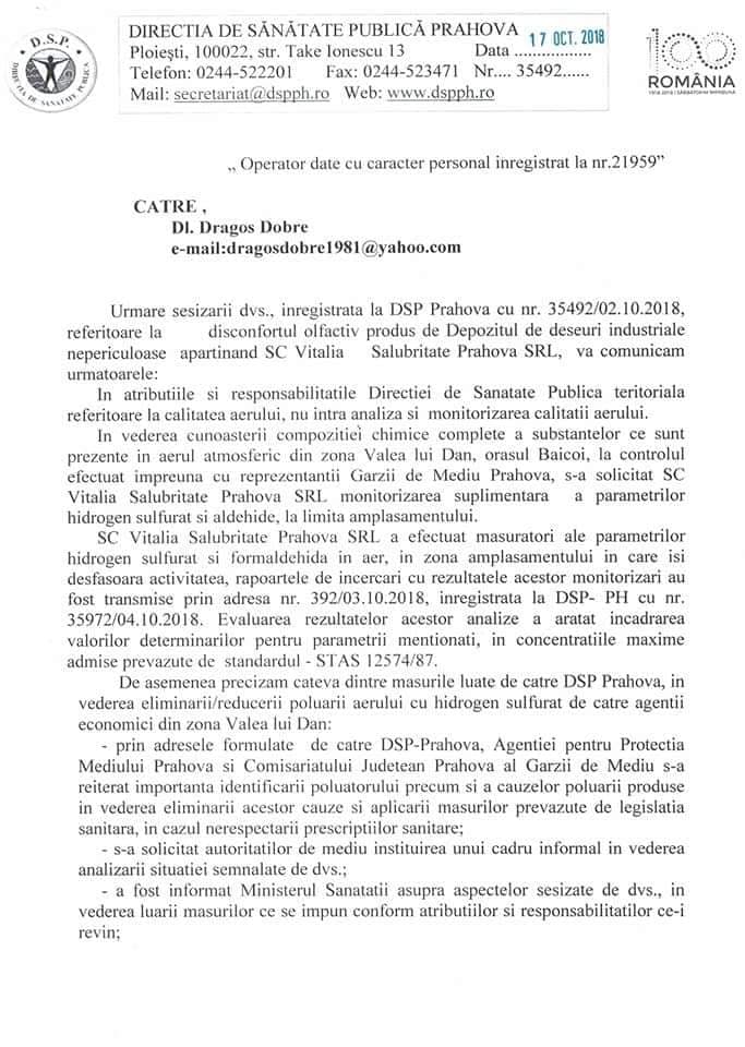 Interesant este că însăși Direcția de Sănătate Publică Prahova nu s-a lăsat intimidată de „guițătorii ecologiști” și a solicitat Asociației pentru Protecția Mediului Prahova și Gărzii Naționale de Mediu să stabilească adevărata sursă de poluare (adică, vechea groapă de gunoi și OMV Petrom). Iar Ministerul Sănătății a fost informat de aceeași Direcție de Sănătate Publică Prahova pentru a dispune eventuale măsuri.