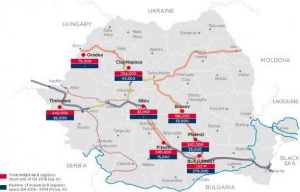 Stocul spaţiilor industriale şi logistice din România a ajuns la finalul celui de-al treilea trimestru al acestui an la 3,42 mil. mp, aproape 90% dintre aceste spaţii fiind situate în Bucureşti, Timişoara, Cluj-Napoca, Piteşti, Ploieşti, Sibiu, Arad, oraşe care au conexiuni cu reţeaua locală de autostrăzi.