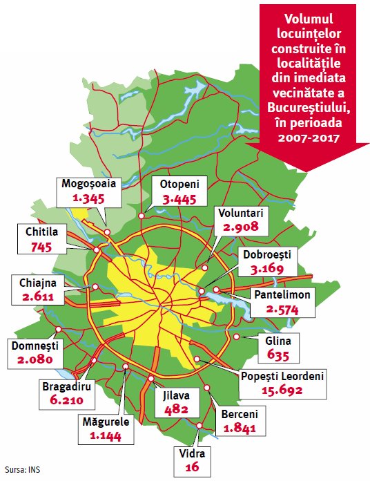 Doar în ultimii zece ani, în localităţile periferice s-a construit un număr aproape dublu de locuinţe faţă de volumul din Bucureşti. Din 2007 şi până în 2017 s-au ridicat aproape 59.000 de locuinţe în judeţul Ilfov, comparativ cu circa 31.000 de unităţi în Capitală, conform datelor centralizate de Institutul Naţional de Statistică (INS). Mai bine de un sfert din volumul de locuinţe construite în localităţile din jurul Bucureştiului au fost ridicate în Popeşti Leordeni. Doar anul trecut, din ultimii şase, volumul de locuinţe livrat anual în această localitate a scăzut sub 1.000 de unităţi. Interesant este că volumul de construcţii din această localitate a atins un vârf în 2014, adică în plină criză. Explicaţia este dată de faptul că tocmai pe fondul crizei, care a condus la apariţia creditelor Prima Casă, construcţiile din această zonă au înflorit, deoarece dezvoltatorii au avansat preţuri chiar şi sub cele percepute pentru apartamente vechi amplasate semnicentral.