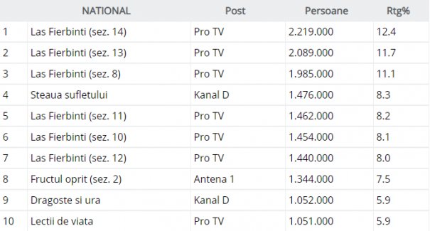 Următoarele două poziţii sunt ocupate de sezoane mai vechi din Las Fierbinţi, redifuzate de Pro TV. Abia pe poziţia a patra a clasamentului se găseşte un serial difuzat de alt post, mai exact Steaua sufletului, de la Kanal D. Antena 1 a bifat locul opt din clasament, cu sezonul al doilea al producţiei Fructul oprit. Serialul produs de Ruxandra Ion a fost urmărit de o medie de 1,3 milioane de telespectatori.