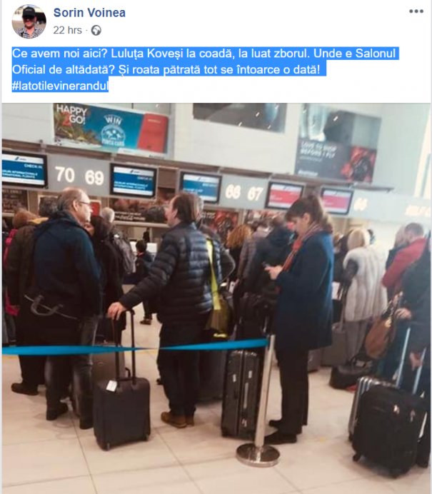 „Ce avem noi aici? Luluţa Koveşi la coadă, la luat zborul. Unde e Salonul Oficial de altădată? Și roata pătrată tot se întoarce o dată!  #latotilevinerandul”, se întreabă Sorin Voinea.