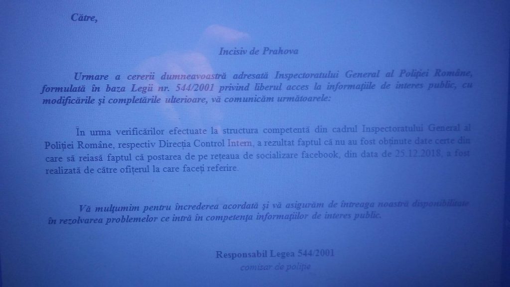 Astfel, prin adresa nr 404833 din 20 martie 2019, am fost informati ca, „in urma verificărilor efectuate la structura competentă din cadrul Inspectoratului General al Poliției Române, respectiv Direcția Control Intern, a rezultat faptul că nu au fost obținute date certe din care să reiasă faptul că postarea de pe rețeaua de socializare facebook, din data de 25.12.2018, a fost realizată de către ofițerul la care faceți referire”.