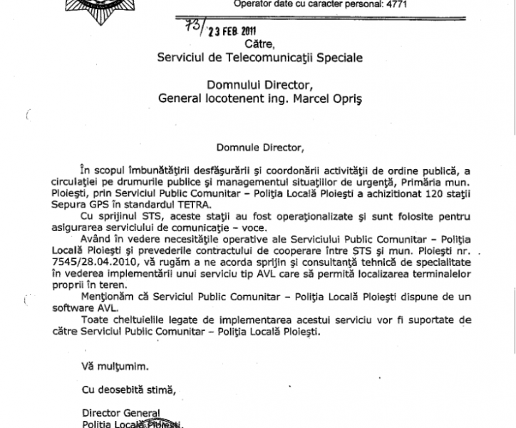 Reamintim că, în luna februarie 2011, Poliția Locală a trimis o adresă către STS, prin care a cerut sprijin și consultanță tehnică de specialitate în vederea implementării unui serviciu AVL. Reprezentanții STS s-au deplasat la sediul Poliției Locale, unde au semnat Procesul Verbal din care reiese că softul a fost implementat și personalul a fost instruit.