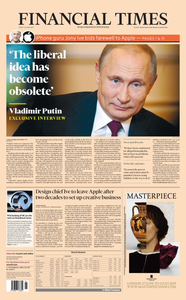 Într-un interviu acordat biroului Financial Times din Rusia, în ajunul summitului G20 de la Osaka (Japonia), președintele rus a declarat că „ideile liberale” și-au „depășit scopul”, și că oamenii se opun imigrației, frontierelor deschise și multiculturalismului.