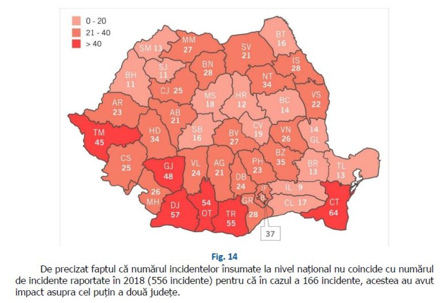Constanța a fost cel mai afectat județ cu 64 de incidente, urmat de Dolj, unde s-au înregistrat 57 incidente, Teleorman cu 55 incidente și Olt unde au avut loc 54 incidente. Pe de altă parte, județele cel mai puțin afectate au fost Ialomița (9 incidente), Bihor și Sălaj (câte 11 incidente). Un număr de 166 de incidente au avut impact asupra a cel puțin două județe.