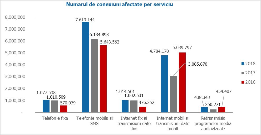 În 2018 s-au înregistrat 556 de incidente cu impact semnificativ asupra securității și integrității rețelelor și serviciilor de comunicații electronice, în creștere cu 66% față de 2017. Acestea au afectat, în total, aproape 15 milioane de conexiuni. Cele mai multe conexiuni afectate de incidentele semnificative sunt cele de telefonie mobilă și SMS (peste 7,6 milioane de conexiuni), urmate de serviciile de internet mobil (peste 4,7 milioane de conexiuni), telefonie fixă (peste 1 milion de conexiuni) și internet fix (aproximativ 1 milion de conexiuni), cele mai puțin afectate fiind cele de retransmisie a programelor audiovizuale (aproximativ 438 de mii de conexiuni).