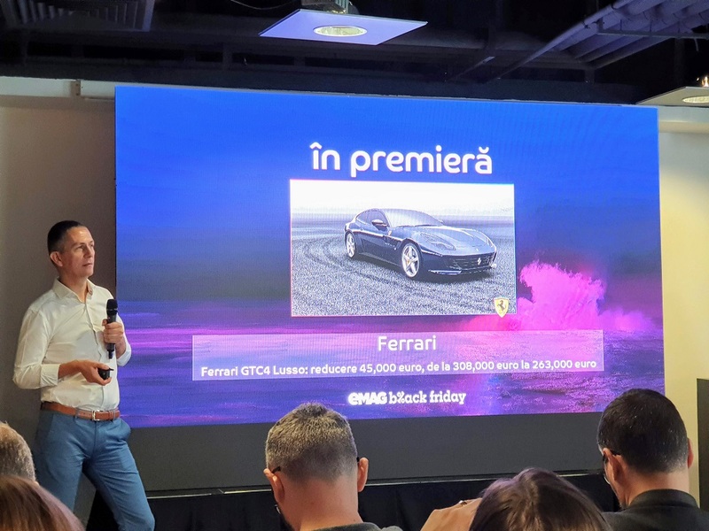 Printre produsele excentrice din ofertă se numără un Ferrari GTC4 Lusso, redus de la 308.000 euro, la 263.000 euro. eMAG va avea în ofertă și lingouri de aur, abonamente la servicii medicale, bilete la Formula 1 sau vouchere la servicii de ride-sharing.