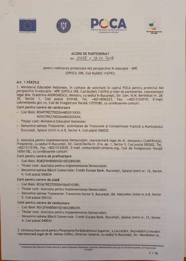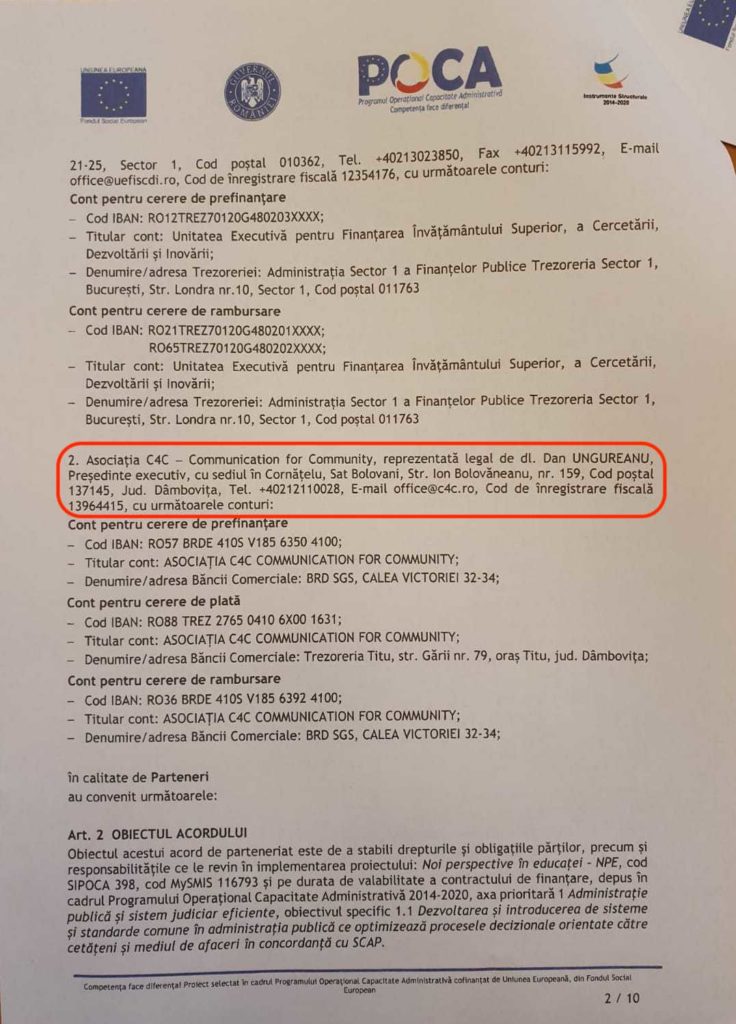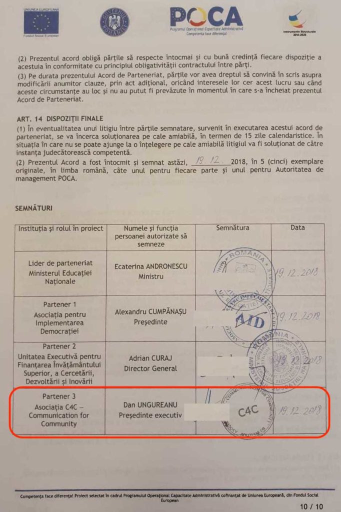 Vezi aici contractul integral încheiat între Ministerul Educației și ONG-ul condus de Alexandru Cumpănașu (Asociația pentru Implementarea Democrației), UEFISCDI – instituția condusă de Adrian Curaj care organizează competițiile pe proiecte în cercetare, și Asociația C4C – Communication for Community, condusă de Dan Ungureanu.