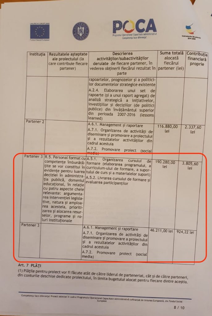 Asociației C4C îi este alocată în acest proiect, încheiat anul trecut, suma de 236.491 lei, pentru activități de formare a personalului și promovare a proiectului, conform documentelor obținute de Edupedu.ro.