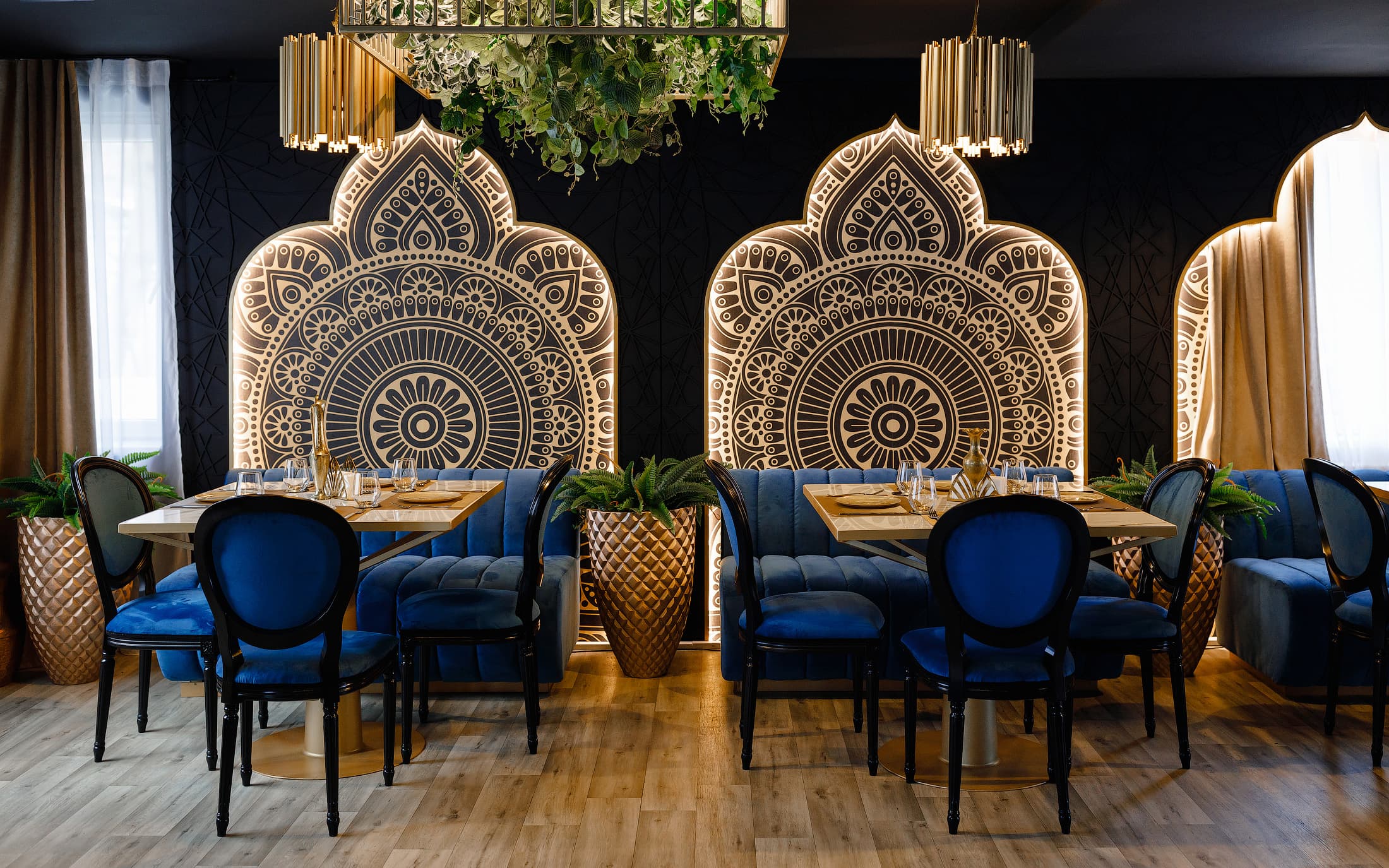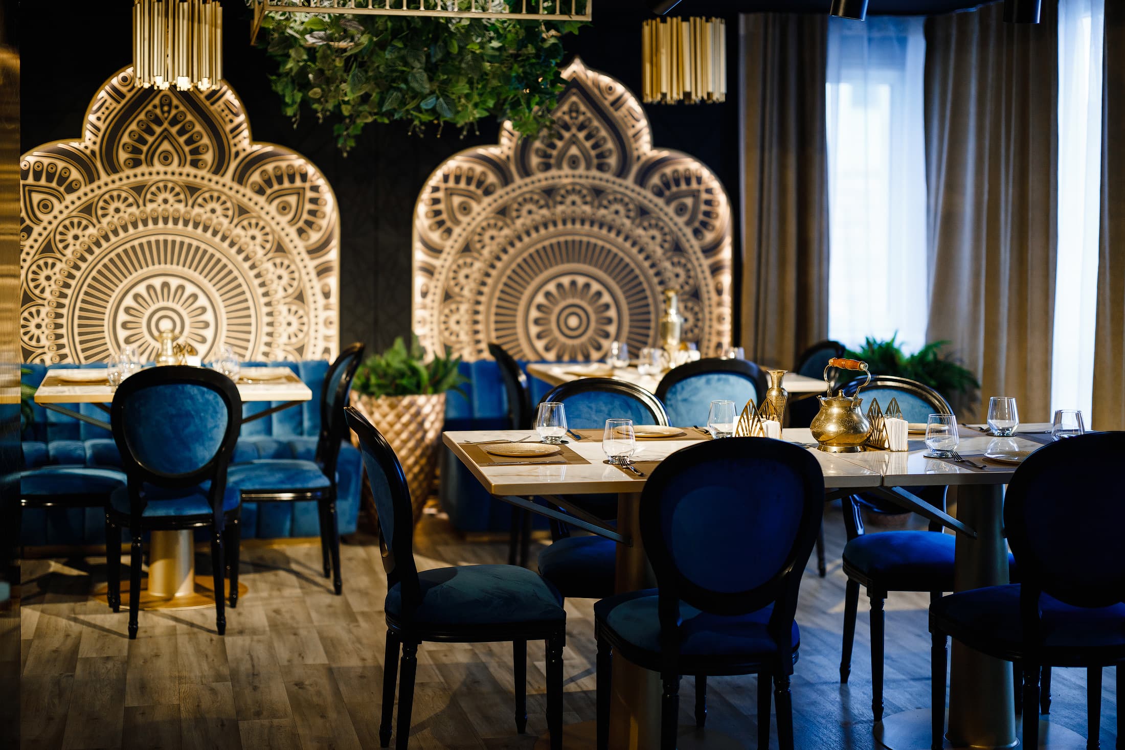 Pe o suprafață de 145 m2, specialiștii în design interior au conservat natura orientală a localului prin introducerea în proiect a elementelor specifice culturii arabe. Gama cromatică aleasă include nuanțe nobile de negru și albastru închis, transformând percepția vizitatorilor într-o plăcere intimă, selectă, iar combinarea acesteia cu mobilierul exclusivist și segmentarea spațiului creează o interacțiune organică și lasă un post-gust aparte. Inserțiile aurii efectuate au dat un farmec deosebit, conferind proiectului o notă de rafinament și lux, dar fără excese. Elementele aurite au fost integrate în câteva zone: pe peretele de accent, decorat cu arcuri ogivale, forme împrumutate din arhitectura arabă, pe picioarele scaunelor de bar, dar și pe corpurile de iluminat suspendate.
