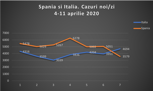 Cifrele raportate astazi însă de Italia sunt însă extrem de îngrijorătoare: Italia a raportat astăzi 4.694 de cazuri noi, în creștere față de 3.951 ieri. Dar este și cel mai mare număr de infecții noi zilnice depistate în ultima săptămână (din 4 aprilie 2020). Spre deosbire, Spania, raportează astăzi cel mai mic număr din 23 martie (din ultimele 19 zile, respectiv 3.579).