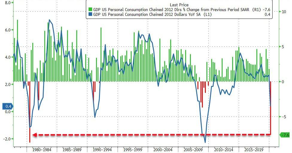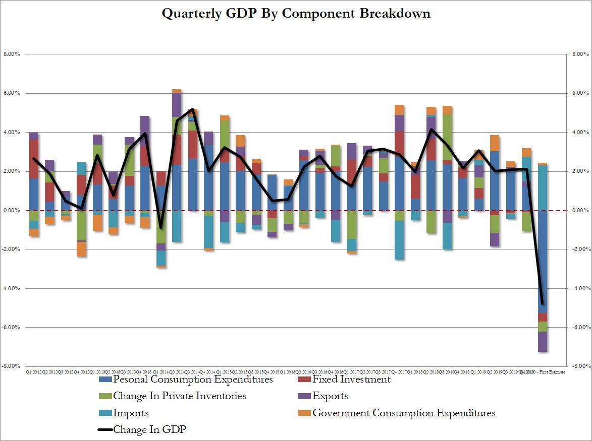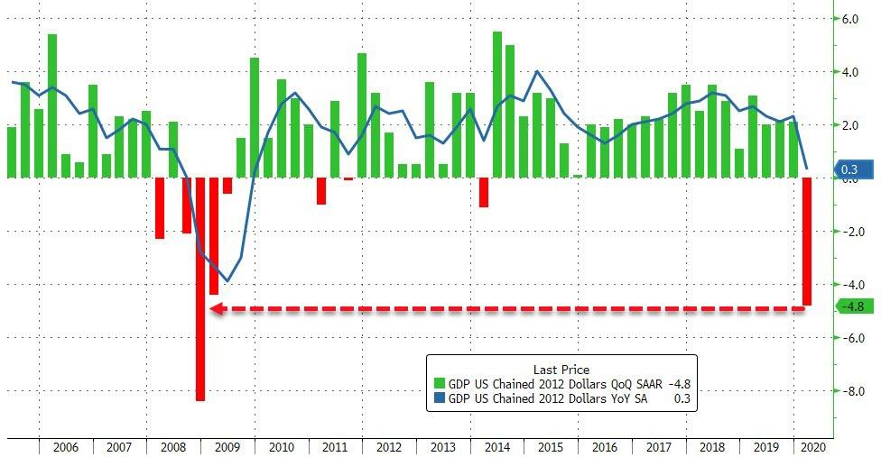 Economia americană s-a contractat în primul trimestru cu o incredibilă valoare de 4,8%, cea mai adâncă scădere de la criza din 2009. Raportată la prețuri actualizate, descreșterea este de 3,5%, adică cea mai mare economie nominală a planetei a ajuns la un PIB anualizat de 21 540 miliarde de dolari, cu 191,2 miliarde de dolari, mai puțin decât referința de anul trecut.