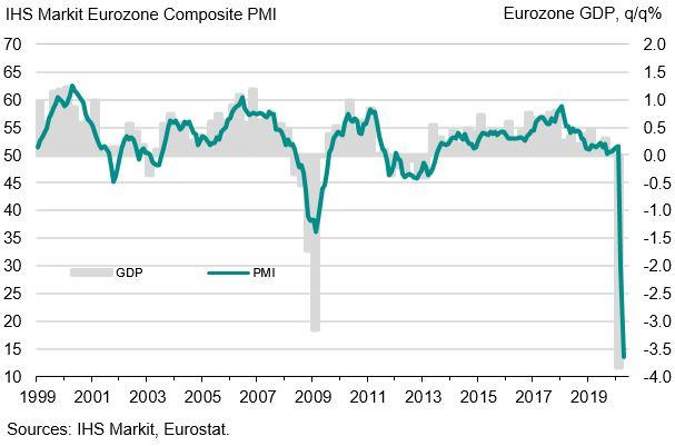 Toate aceste date încep să compună o imagine într-adevăr înspăimântătoare. Motiv pentru care Banca Centrală Europeană își menține programul de cumpărare a activelor financiare în suferință (asset purchase programme APP), în sume lunare de câte 20 de miliarde de Euro, cu o sumă adițională de 120 de miliarde de Euro până la sfârșitul anului . Se menține programul de 750 miliarde de Euro pentru cumpărarea de produse financiare afectate de pandemie pandemic emergency purchase programme (PEPP) și se extinde aplicabilitatea acestui program la refinanțarea datoriilor pe termen lung, pandemic emergency longer-term refinancing operations (PELTRO). Iar președintele Băncii Centrale Europene, Christine Lagarde, vorbește despre o contracție economică de până în 12% pentru PIB-ul Euro-zonei în anul 2020, cu un vârf negativ de peste -15% în trimestrul II.…