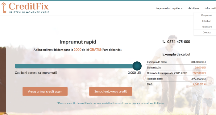 Un al doilea exemplu este CreditFix IFN, companie înregistrată în 2015. Compania a cerut credit garantat de stat și cu dobândă plătită de stat în 29 aprilie 2020, iar oferta lor prezentată de pe site ne arată că vrea să atragă credit cu dobândă zero (plătită de stat) și să o plaseze categoriilor vulnerabile de populație cu până la 4.343%. Pe site publică și cât ar fi dobânda zilnică pentru un credit de 3.000 de lei: 36 de lei. Adică 1,2% dobândă pe zi: