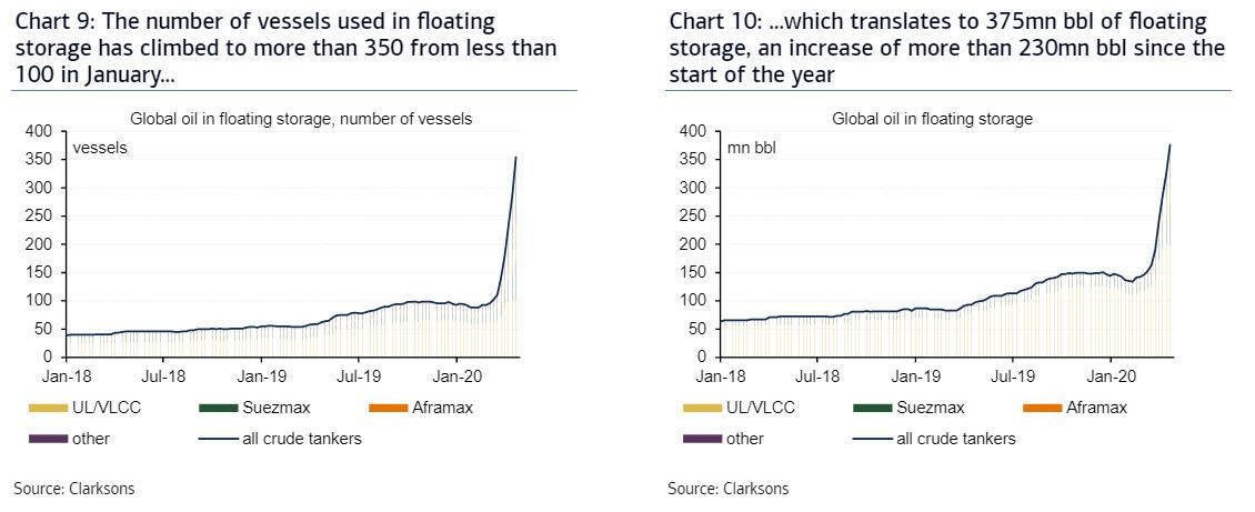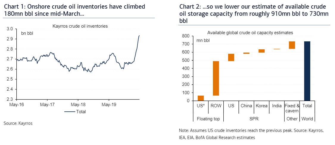 Cantități imense de țiței continuă să ocupe părți din ce în ce mai mari ale capacităților globale de stocare. Astfel, în ultimele cinci săptămâni, peste 180 de milioane de barili s-au depozitat în lume în plus față de stocurile deja existente. Practic, 3 miliarde de barili sunt astăzi depozitate pe planetă, capacitățile libere de depozitare reducându-se la doar 730 milioane de barili.