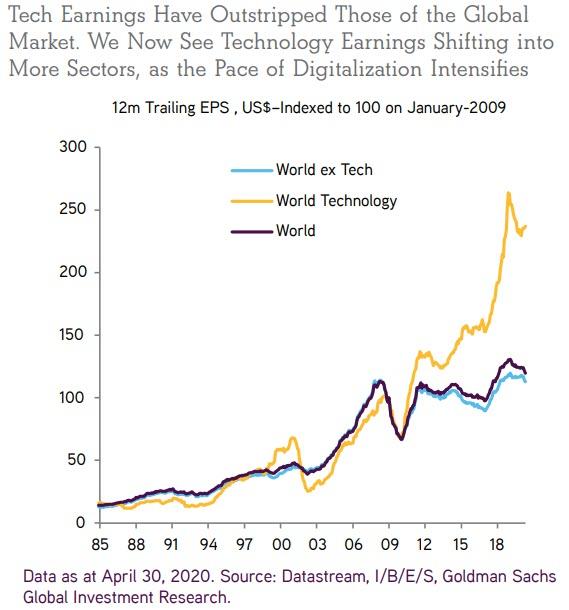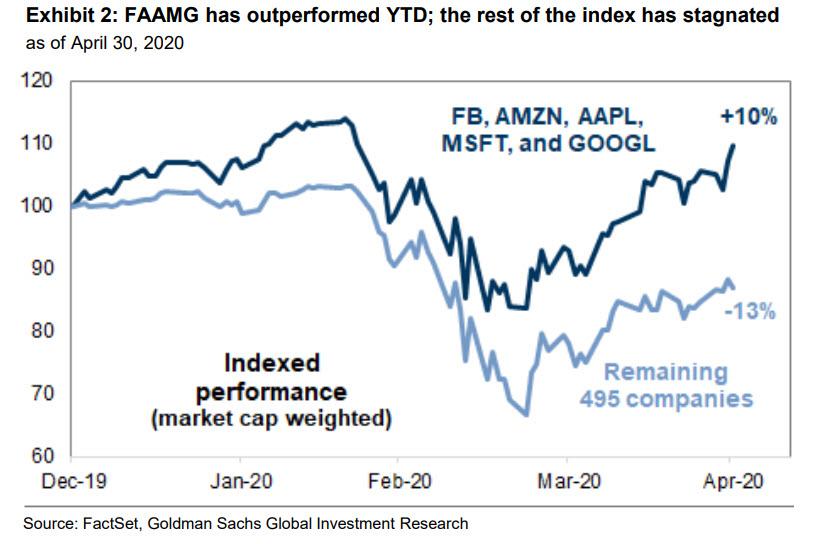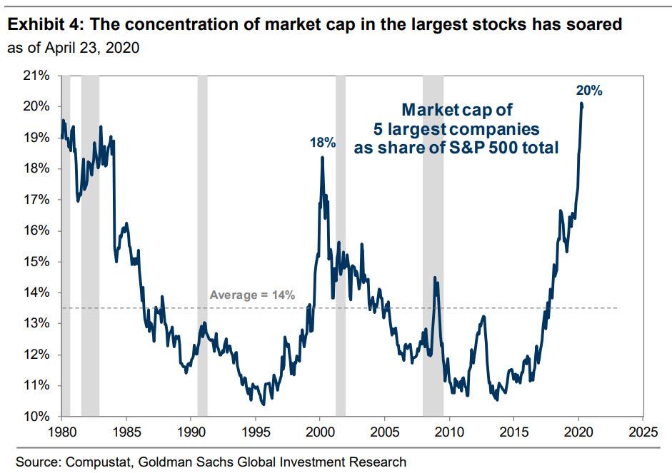 Fiecare al cincilea dolar din capitalizarea campionilor bursei americane se regăsește în grupul celor mai mari companii, toate din așa-numitul domeniu al „tehnologiei”. Goldman Sachs a creeat indicatorul FAAMGS (cele mai mari cinci acțiuni din domeniul „tech” din piață), care include titlurile : Facebook (FB), Amazon (AMZN), Apple (AAPL), Microsoft (MSFT) și Alphabet (GOOG). Acestea au ajuns să reprezinte 20%, o cincime, din capitalizarea celor 500 de companii din indicele S&P 500, cel mai ridicat nivel atins vreodată de primele 5 companii din compoziția indicelui respectiv:
