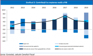„Dacă cheltuielile de consum ale populației au reprezentat principalul motor al creșterii în majoritatea anilor anteriori (aflate însă pe un trend descendent după contribuții de 6,3 pp în 2017, respectiv de 4,6 pp în 2018), este de remarcat revirimentul semnificativ al formării brute de capital fix după ce avusese o contribuție negativă (-0,3 pp) la creșterea economică din anul 2018 (parțial, și ca urmare a unui efect de bază favorabil).