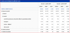 Banca Națională a publicat raportul privind balanţa de plăţi şi datoria externă – aprilie 2020. Astfel, În perioada ianuarie – aprilie 2020, contul curent al balanţei de plăţi a înregistrat un deficit de 1 782 milioane euro, comparativ cu 2 258 milioane euro în perioada ianuarie-aprilie 2019; în structură, balanţa bunurilor a consemnat un deficit mai mare cu 880 milioane euro, balanța serviciilor a înregistrat un excedent mai mare cu 465 milioane euro, balanța veniturilor primare a înregistrat un excedent mai mare cu 427 milioane euro, iar balanța veniturilor secundare a înregistrat un excedent mai mare cu 464 milioane euro.