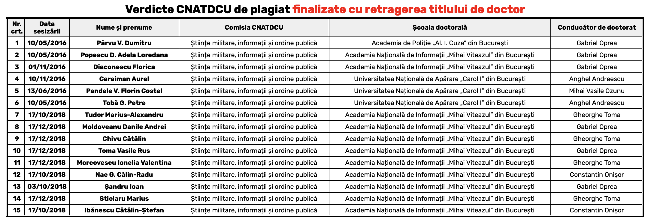 În total, la nivelul Comisiei de Științe militare, informații și ordine publică au fost retrase 38 de titluri de doctor, 4 decizii sunt în faza de contestare, o sesizare a fost respinsă pentru că era neconformă, iar alte 14 sesizări sunt în lucru.