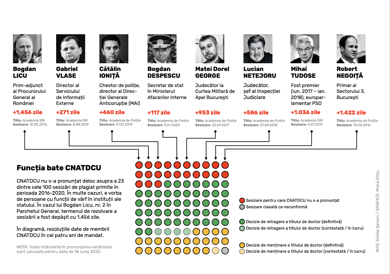 Însă, o analiză individuală a sesizărilor relevă o realitate care poate fi catalogată cel puțin ciudată: în cazul persoanelor care încă ocupă funcții publice importante, CNATDCU s-a ferit să emită verdicte, chiar dacă lucrul asta a însemnat tergiversări întinse pe ani de zile și depășirea de zeci de ori a termenelor prevăzute de legislație.