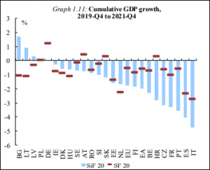 Practic, majoritatea statelor membre suferă o înrăutățire a prognozei de scădere în această perioadă, cu perspcetive pozitive doar pentru trei state și cu Italia campioană la nedoritul indicator de contracție a economiei (cu -4,75% pe ansamblul celor doi ani), urmată de Spania (aproape -4%) , Portugalia și Franța. România se află undeva la mijlocul clasamentului, pe poziția a 11-a în clasamentul celor mai puțin afectate state. Din regiune, mai bine ca noi vor sta polonezii, ungurii, bulgarii și două state baltice, în vreme ce croații și cehii vor fi printre cele mai afectate națiuni.