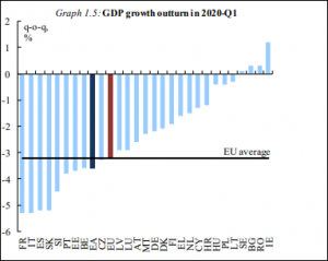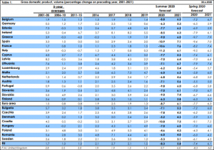 Ceea ce frapează încă din start este pesimismul din ce în ce mai mare care domină prognozele economice ale Comisiei: prognoza de contracție pentru zona Euro a evoluat de la -7,7% în primăvară la -8,7% acum, iar pentru întreaga Uniune de la -7,4% la -8,3%, cu evoluții la fel de pesimiste pentru prognoza de creștere de anul viitor: de la 6,3% la 6,1% pentru zona Euro și de la6,1% la 5,8% pentru ansamblul UE. De menționat este și faptul că geneza pesimismului european este legată de degradarea semnificativă a perspectivelor economiei globale: dacă în primăvară se întrevedea o contracție de -2,9% la nivel planetar (excluzând Uniunea Europeană), astăzi, contracția prevăzută a ajuns la -3,9%, însoțită fiind de prăbușirea comerțului internațional cu -11,5%!