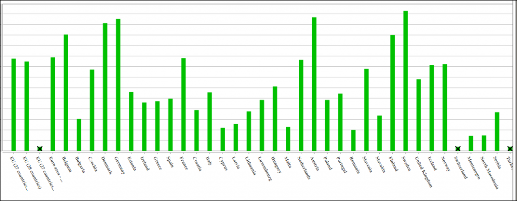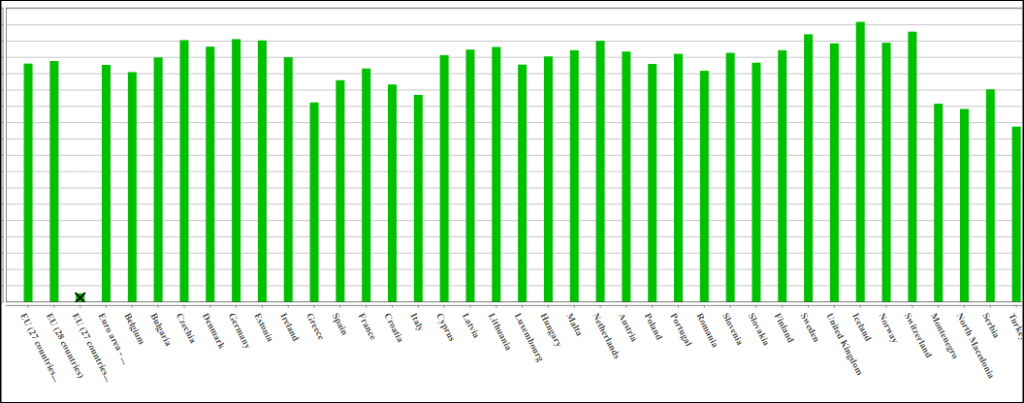 Aici, cu 70,9%, România nu mai pare atât de departe de media UE (puțin peste 73%), dar e tot în urma Poloniei (73%) și Ungariei (75%), dar este peste Grecia (doar 61%), Italia (63%) sau Spania (65%).