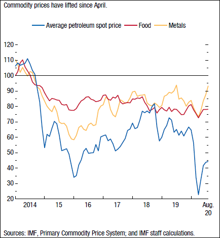 Prețul țițeiului rămâne încă foarte scăzut, la mai puțin de jumătate față de nivelul pre-pandemic, prețul alimetelor este în scădere cu 20% iar prețul metalelor se apropie rapid de nivelurile din 2019: