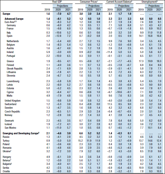 Economia continentală va scădea cu 7% anul acesta și va crește cu 4,7% anul viitor. Indicele prețurilor de consum va crește cu 2% anul acesta și cu 2,4% anul viitor; excedentele de cont curent vor urca cu 1,7% anul acesta și cu 1,9% anul viitor. dar acestea sunt valori medii: dacă Germania va avea o contracție de 6% anul acesta, Franța va avea una de 9,8%, Italia una de 10,6%, iar Spania una de 12,8%! Polonia se va contracta cu 3,6%, România cu 4,8%, iar Ungaria cu 6,1%. În 2021, Polonia va crește cu 4,6% (același ritm cu cel al nostru), iar Ungaria doar cu 3,9%. În regiune, România pare a se bucura de cea mai mare stabilitate a prețurilor (+2,9% anul acesta și +2,5% în 2021), față de Polonia (3,3%, respectiv 2,3%) și Ungaria (3,6% și 3,4%). Noi vom fi medaliați cu bronz în  UE la deficitul de cont curent (după Grecia și Cipru) cu -5,3% în 2020 și -4,5% în 2021. Polonia va avea excedente (3%, respectiv 1,8%), iar Ungaria deficite ușoare (-1,6%, respectiv -0,9%). În ceea ce privește șomajul, Estul Europei nu va suferi foarte mult: