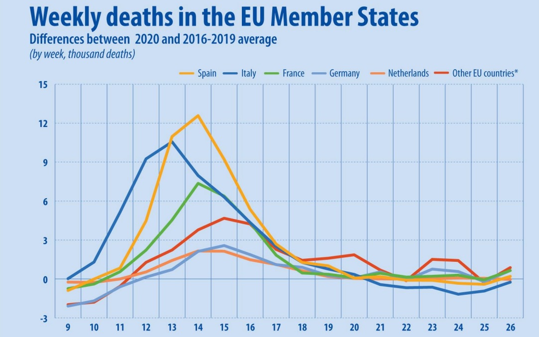 De asemenea, cele mai multe decese suplimentare, în perioada mai-iunie, au fost în țările cel mai afectate de pandemie: Spania  +48.000, Italia +46.000, Franța +30.000, Germania și Țările de Jos, aproximativ +10.000 fiecare.