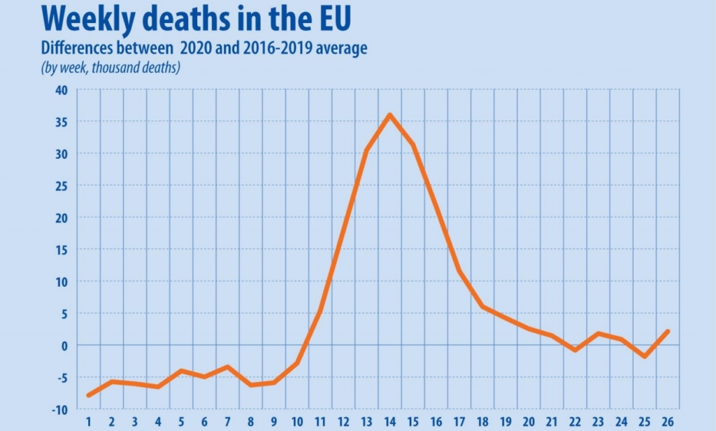 Săptămâna cu cel mai mare salt peste medie a fost 30 martie  – 5 aprilie, când s-au înregistrat cu 36.000 mai multe decese. De la începutul lunii mai, numărul deceselor peste media săptămânală a scăzut sub 5.000, mai arată datele Eurostat.
