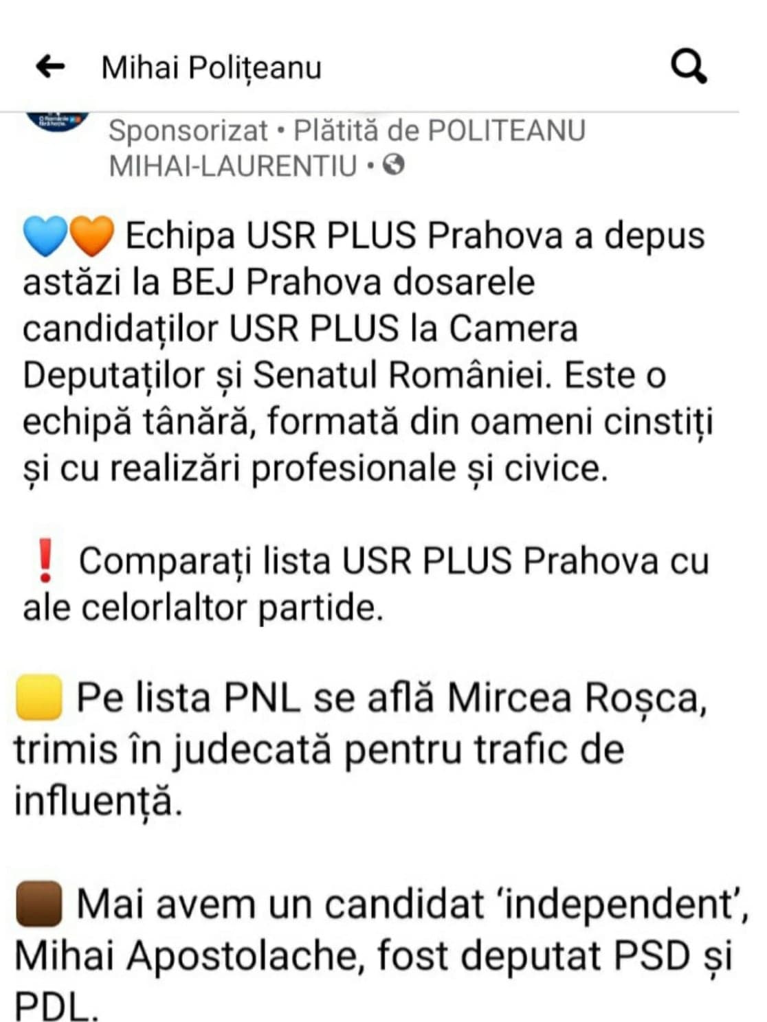 ”Recunosc că mi-au dat lacrimile văzând sutele de mesaje de susținere și sutele de cereri pentru formularul cu semnături de susținere a candidaturii mele la Parlament ca independent. Solidaritatea dumneavoastră și a colegilor mei mă motivează și îmi arată faptul că oamenii au nevoie de o voce puternică în Parlament, o voce a prahovenilor și nu a partidelor. Strângem până miercuri cele 4000 de semnaturi și joi, 22 octombrie, în ultima zi de depunere a candidaturilor, îmi depun candidatura în numele dumneavoastră. Împreună scriem istoria !” era mesajul postat de Mihai Apostolache, pe o retea de socializare.