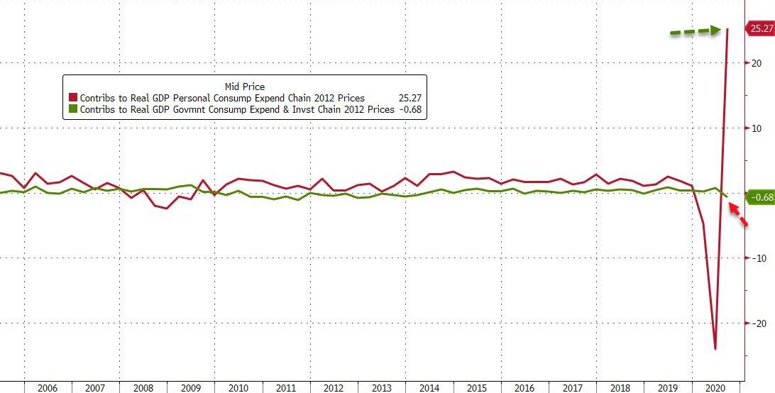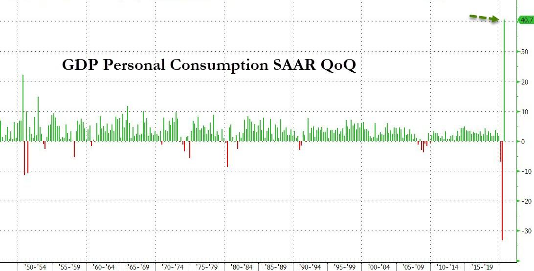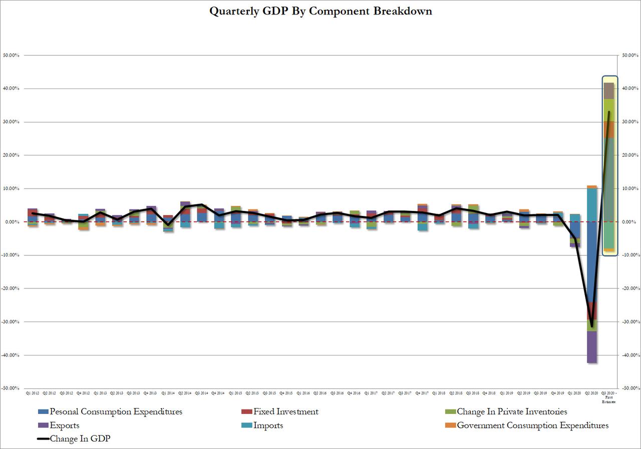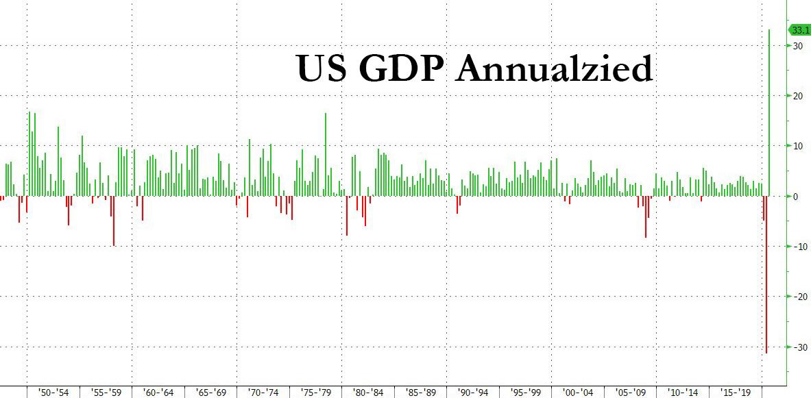 Cine ar fi crezut că va vedea vreodată asemenea grafice ale variațiilor trrimestriale ale PIB-ului american? Și totuși se întâmplă. pentru a înțelege uriașul optimism care domină acum economia americană, trebuie să adăugăm că așteptările analiștilor erau, ieri, la o creștere anualizată de 32%, după ce , în iulie toată lumea abia spera la o firavă revenire de 14% în ritm anualizat pentru trimestrul al III-lea al anului curent. Așadar, în numai trei luni economia americană a parcurs un drum uriaș de la un pesimism paralizant care vedea o recuperare doar pe jumătate a teribilului trimestru secund în trimestrul de vară la cea mai importantă creștere trimestrială din istorie.