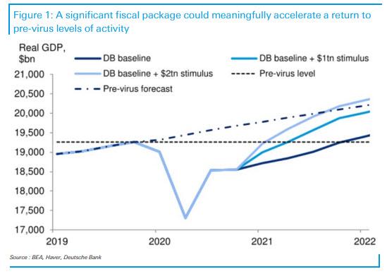 În acest context, nu e de mirare că economia poate reveni la nivelul de dinainte de pandemie, la sfârșitul anului viitor, dacă nu intervine o nouă injectare de stimuli financiari. Dacă administrația și FED vor pompa 1 000 de miliarde de dolari, economia americană vca atinge aproape același nivel ca cel care ar fi fost atins fără pandemie, iar dacă stimulul financiar va depăși 2 000 de miliarde de dolari, America va ajunge să crească mai mult decât ar fi crescut fără pandemie. O spune o analiză Deutsche Bank :