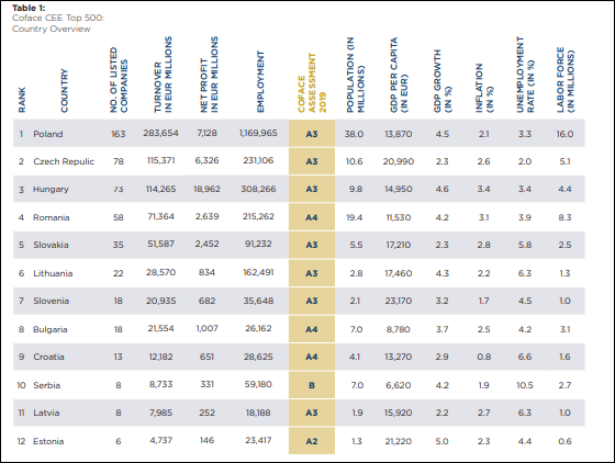 O treime din companiile care domină Estul Uniunii Europene vin din Polonia (163), 78 vin din Republica Cehă, 73 din Ungaria, 58 din România, 35 din Slovacia, restul statelor din regiune având o reprezentare mai mică. Peste 38% din cifra de afaceri integrată a acestor 500 de companii se produce în Polonia (peste 283 miliarde de euro), câte 15% în Ungaria și în Republica Cehă (câte 115 miliarde de euro) și aproape 8% în România (71 de miliarde de euro).