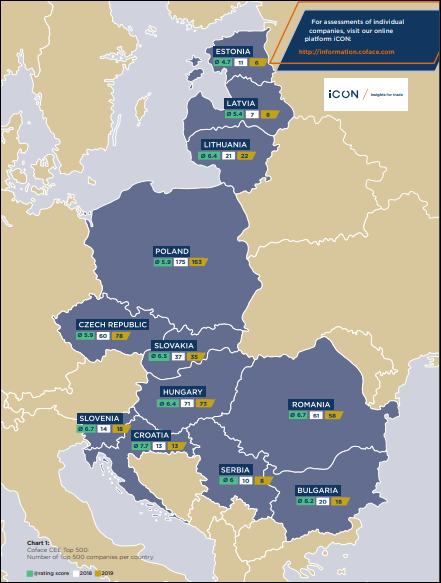 Printre primele 500 cele mai mari companii din Europa Centrală și de Est, România mai avea în anul 2019 doar 58, cu 3 mai puține decât în 2018 http://img.go.coface.com/Web/COFACE/%7B459d4721-e8f8-4649-9077-e3ad41e18ebe%7D_Coface_CEE_Top_500_Ranking_2020_FINAL.pdf