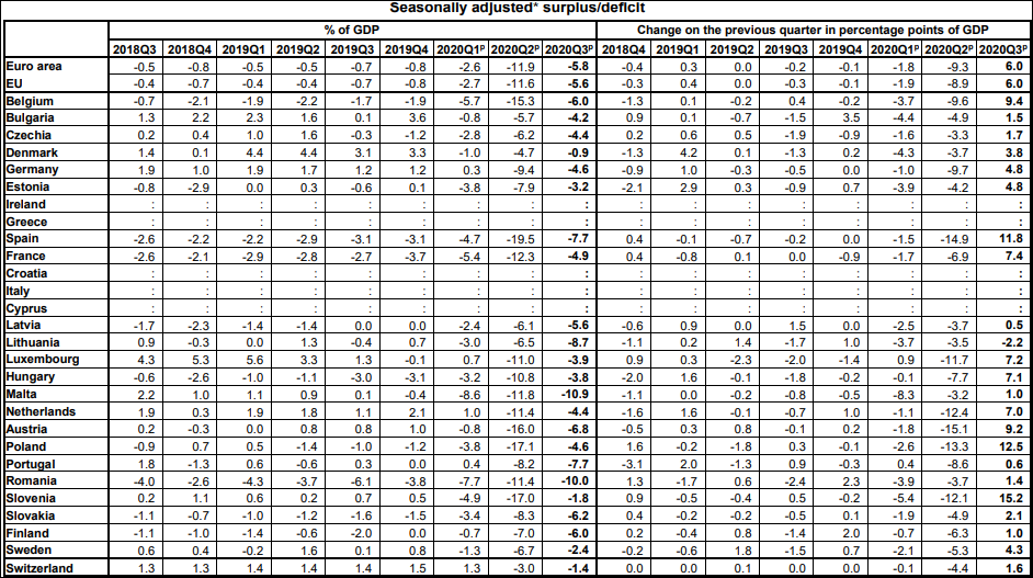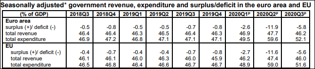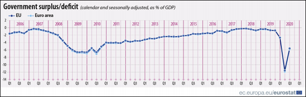 La nivelul întregii Uniuni, deficitul bugetar se cifrează la 5,6% din PIB pentru trimestrul de vară din 2020, iar în zona euro atinge nivelul de 5,8%. Evoluția la nivel continental indică o revenire importantă, de la un neverosimil deficit de 11,6% pe trimestrul anterior (trimestrul II al anului 2020), dar se observă păstrarea unui deficit neobișnuit de mare pentru un spațiu atât de prudent în anii anteriori. Dacă în 2018 și 2019, deficitele trimestriale nu depășeau 1% din PIB-ul agregat, anul trecut acesta a explodat, pur și simplu, pe fondul unei pandemii încă nestrunite de guvernele naționale: