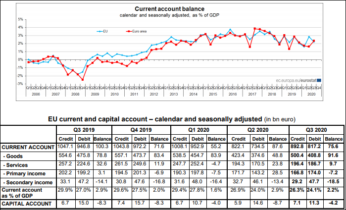Mai remarcăm și faptul că Polonia are un excedent de cont curent de 3,2 miliarde de euro pe trimestrul III 2020, Ungaria are un deficit minor (100 de milioane de euro), iar România are un deficit de cont curent de 3,9 miliarde de euro în acel trimestru. Pe primele trei trimestre din 2020, totalizam un deficit comercial de 7,8 miliarde de euro.