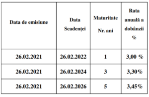 Potrivit comunicatului Ministerului Finanțelor, pentru noua emisiunea Tezaur, dobânzile sunt de 3% pentru titlurile cu maturizare la un an, 3,30% pentru o perioadă de 3 ani și 3,45% la o maturizare de 5 ani. Pentru comparație, în ianuarie dobânzile pentru aceleași intervale de răscumpărare au fost de 3,25%, 3,5% și, respectiv 3,75%.
