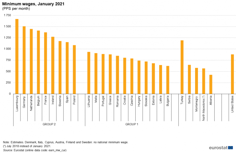 Dacă ne raportăm însă la valoarea salariului minim exprimată în prețuri comparabile (PPS -la standardul puterii de cumpărare), România urcă chiar pe poziția a 20-a în Uniune, înaintea multor state estice: