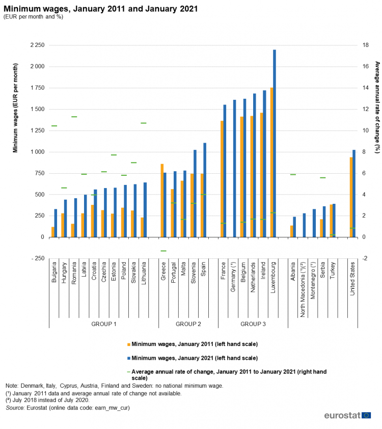 Dacă ne raportăm, însă, la dinamica acestui indicator în ultimii 10 ani, o să observăm că România este campion european la creșterea sumei (în euro) salariului minim cu 11,3% plus în 2021 față de 2011, urmată fiind de Lituania și Bulgaria, cu puțin peste 10%. Cu 458 de euro/lună salariu minim în ianuarie 2021, România depășește Ungaria (442 euro/lunar) și Bulgaria (332 euro/lună), dar este încă la distanță apreciabilă de Cehia (579 euro/lună) sau Polonia (614 euro/lună). Din păcate, în vârful clasamentului european se găsesc tocmai statele în care emigrează românii: Germania (1614 euro/lună), Franța (1544 euro/lună) și Spania 91108 euro/lună) , Marea Britanie (1583 euro/lună). Italia nu are stabilit salariul minim.