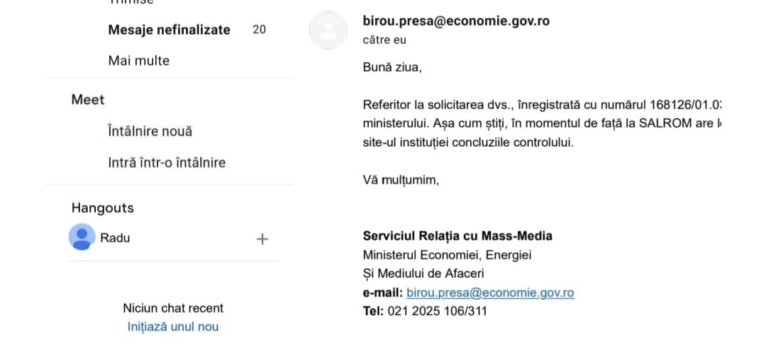 Fata de acestea, inca spernad, in buna dumneavostra credibta, va rugam sa recuperati in totalitate prejudiciul cauzat Societatii Nationale a Sarii SA – “Salrom” si sa ne raspundeti punctual la cele solicitate, precum si la masurile luate in fata noilor date (daca sesizati Corpul de Control al Premierului să extindă misiunea de control pe aceste teme, in mod oprativ, asa cum s-a procedat dupa aparitia articolului nostru din data de 25.02.2021.).