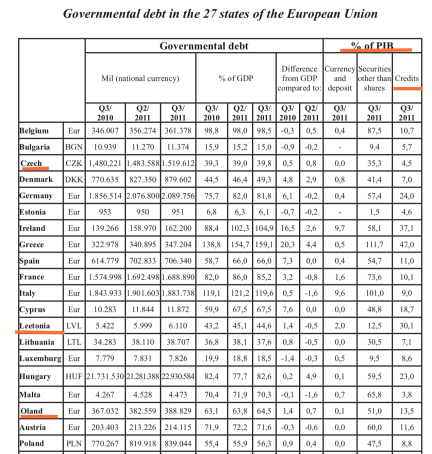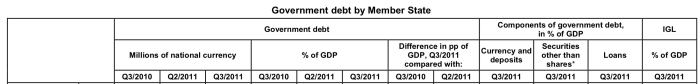 Observați așadar că nu este nicio centralizare propie pe baza datelor Băncii Centrale Europene ci pur și simplu date și calcule copiate. Observați că Marcu și Meghișan nu cunosc faptul că în limba engleză (și în cercetarea economică) împrumuturile sunt ,,loans” și nu ,,credits”, că a 3-a coloană rândul 2 nu indică faptul că datele și calculele se referă la diferența în puncte procentuale raportate la PIB în trimestrul 3 2011 compartiv cu celelalte, și, desigur, tăierea ultimei coloane din tabel pentru că Marcu și Meghișan au găsit gred de descifrat păsăreasca Eurostatului – IGL, și prin urmare, deși acesta era un element de strictă noutate publicat de Eurostat și care îi interesează pe analiști și cercetători, au decis să zboare coloana.
