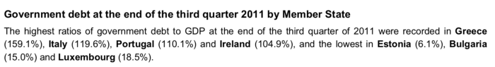 - Conținutul copiat și distorsionat (comunicatul Eurostat se referă la datoria publică la sfârșitul trimestrului III, iar conținutul copiat susține aceleași procente, dar pentru întreg anul 2011):