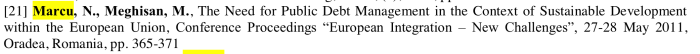 - Articol 2: ,,The need for Public Debt Management in the Context of Sustainable Development within the European Union”, este publicat în 2011 în Analele Universității din Oradea (non-ISI) și semnat co-autorat cu o colaboratoare de lungă durată a lui Nicu Marcu, Meghișan Georgeta-Mădălina.